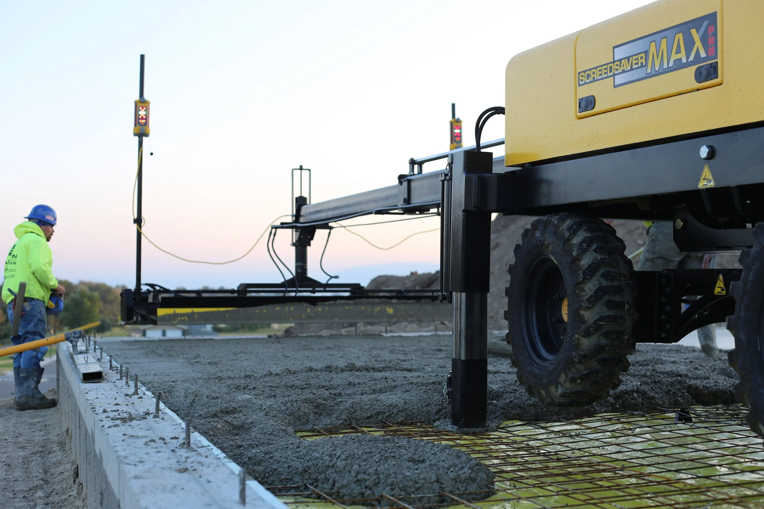 Construction site with a worker operating a screeding machine on a concrete surface.
